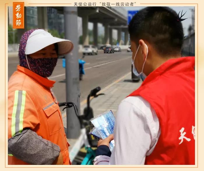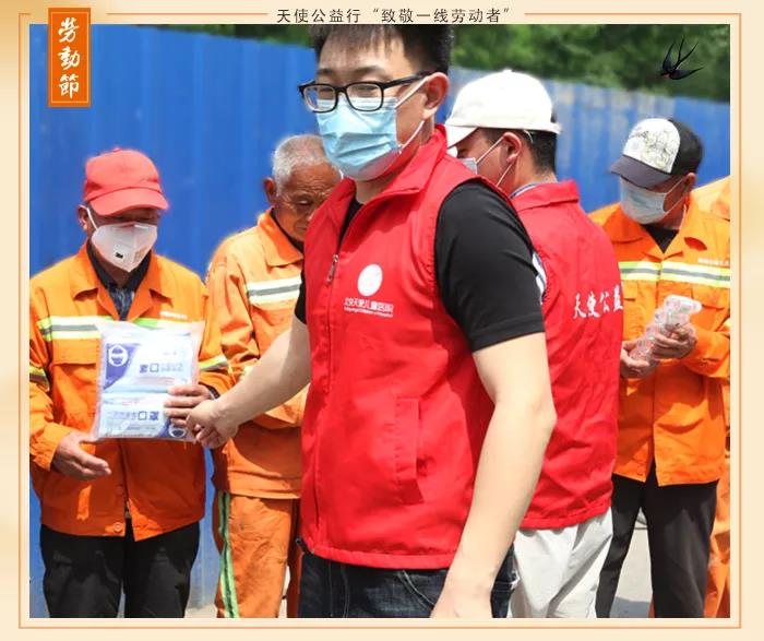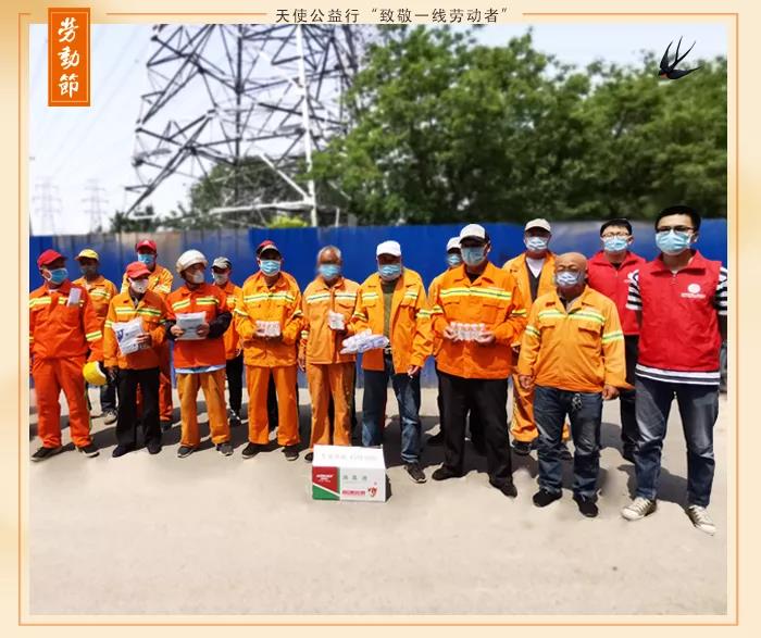 2020.5.1日,我院天使公益行向四惠环卫站环卫工人、外卖小哥、清洁工人、社区工作者、交通警察等人群赠送饮用水、口罩、防疫宣传折页、小礼品等物资,向奋战在一线的劳动者致敬。