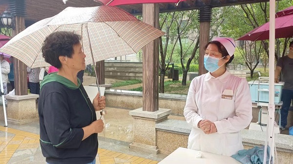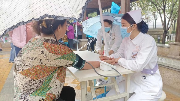 面对每一位来到义诊台前的居民,医护人员认真与其沟通,耐心询问他们的日常生活习惯及身体状况,针对每个居民的情况,细心地叮嘱他们日常生活中的注意事项,并提出合理膳食、适量运动等生活指导。