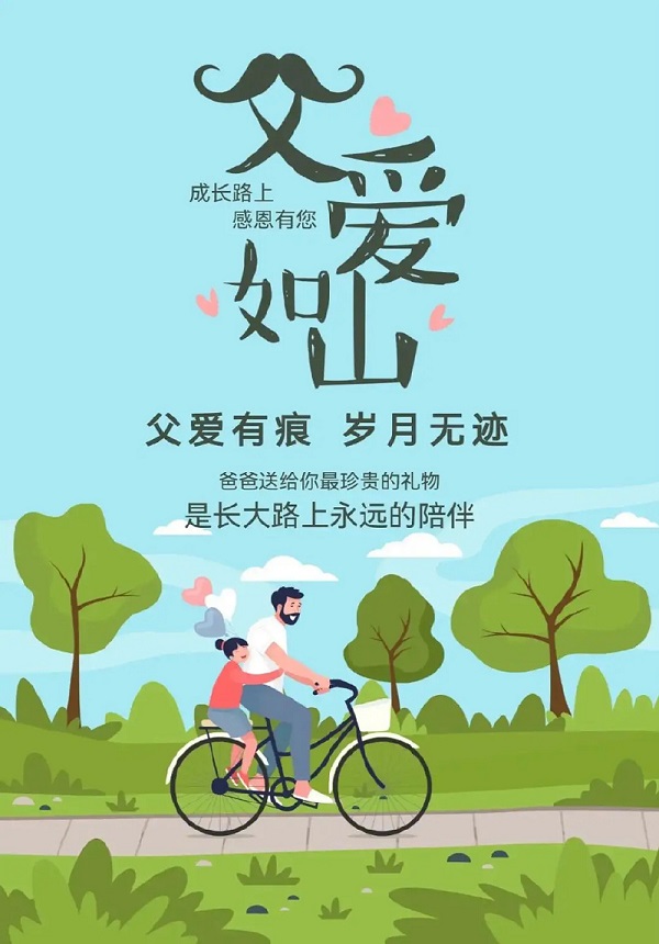 父亲节,感恩父爱,父爱如山。父亲,您用粗糙有力的大手握我的小手,用勤劳与坚忍背负着家庭的重担。您用您的臂膀呵护我长大。您的爱厚重,让我学会尊重;您的爱宽容,让我绽放笑容;您的爱严厉,让我明白努力;您的爱博大,让我健康长大。
